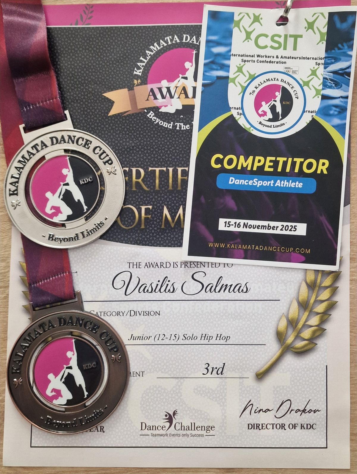 Με ιδιαίτερη υπερηφάνεια ανακοινώνουμε ότι ο μαθητής της Α’ Γυμνασίου Βασίλης Σαλμάς διακρίθηκε στον διεθνή διαγωνισμό χορού International Kalamata Dance Cup, ο οποίος πραγματοποιήθηκε πρόσφατα με συμμετοχές από την Ελλάδα και το εξωτερικό, στις 16 Νοεμβρίου 2025, στην πόλη της Καλαμάτας.