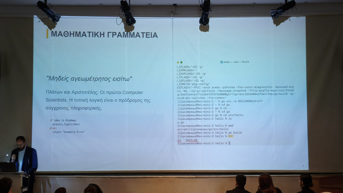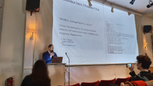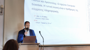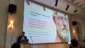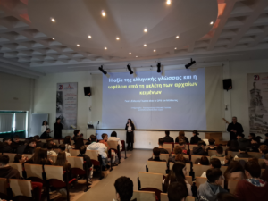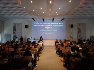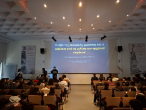 Πρώτος εισηγητής ο κ. Αντωνογλούδης Χρυσοβαλάντης, απόφοιτος του ΑΠΘ, ανέδειξε την αξία της αρχαίας ελληνικής γλώσσας και την ωφέλεια από τη μελέτη των αρχαίων κειμένων. Σημαντική αναφορά μάλιστα έγινε στην αξία των ανθρωπιστικών σπουδών στη σύγχρονη τεχνοκρατική κοινωνία.