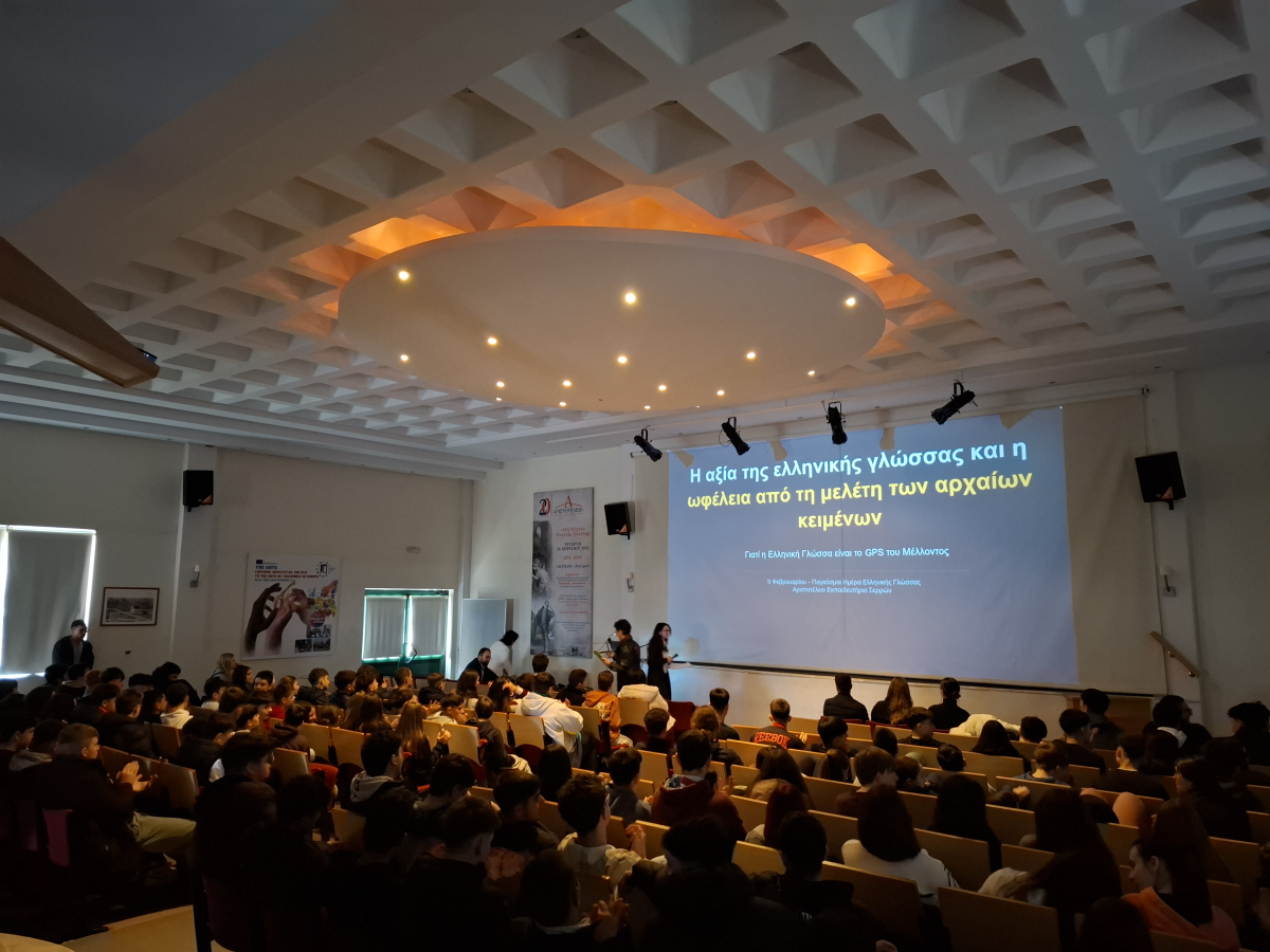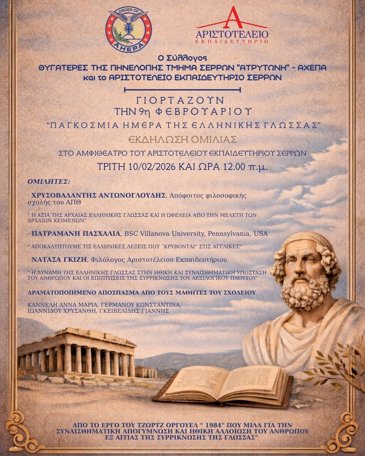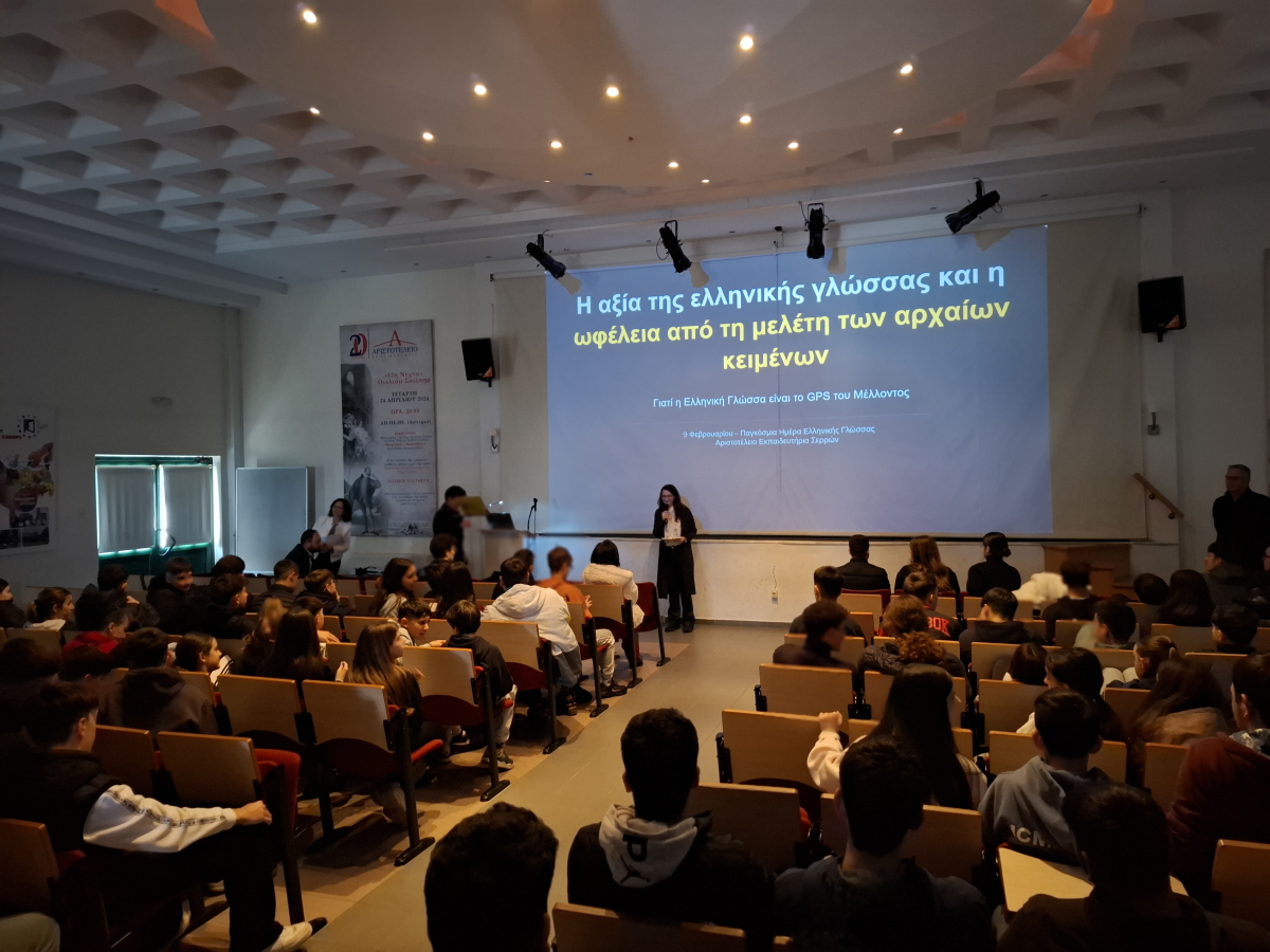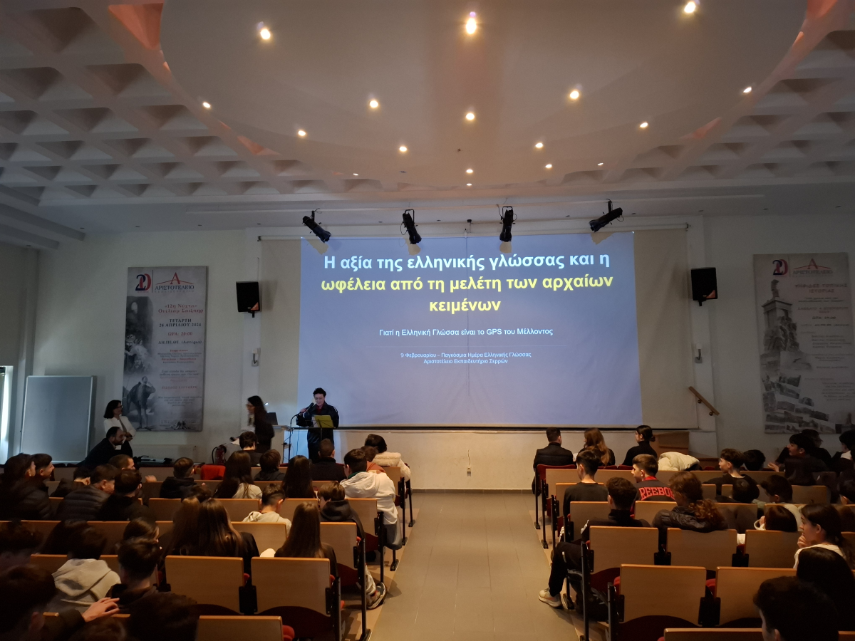 Η ημέρα τιμής της ελληνικής γλώσσας αποτέλεσε το έναυσμα της   συνεργασίας των εκπαιδευτικών και των μαθητών του σχολείου μας με τον σύλλογο οι Θυγατέρες της Πηνελόπης τμήμα ΣερρώνΑΤΡΥΤΩΝΗ” – ΑΧΕΠΑ. Στο Αμφιθέατρο του Αριστοτελείου Εκπαιδευτηρίου  προσκεκλημένοι, εκπαιδευτικοί και μαθητές με ανοιχτό νου, σεβασμό στο μακραίωνο παρελθόν  αλλά και ευθύνη απέναντι στο μέλλον της ελληνικής γλώσσας παρακολούθησαν τους ομιλητές που ανέδειξαν την διαχρονική αξία και τη δύναμη της γλώσσας.