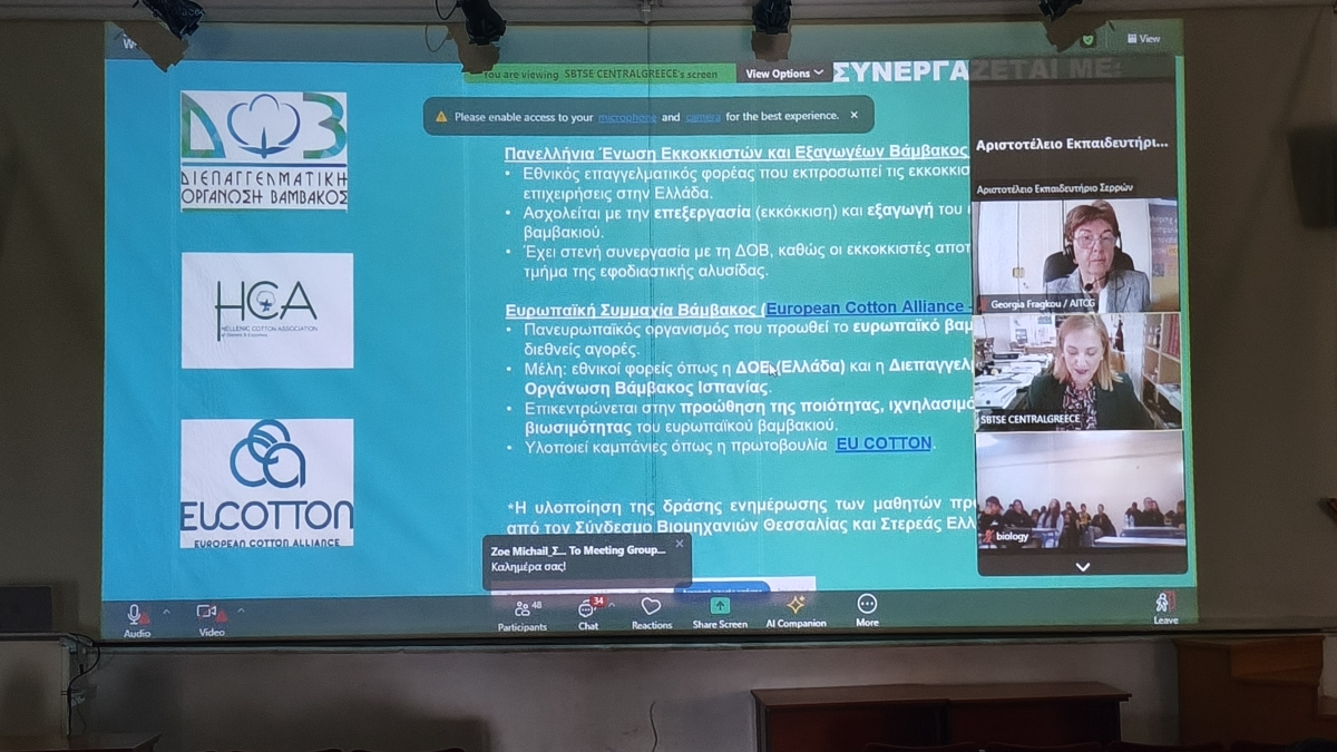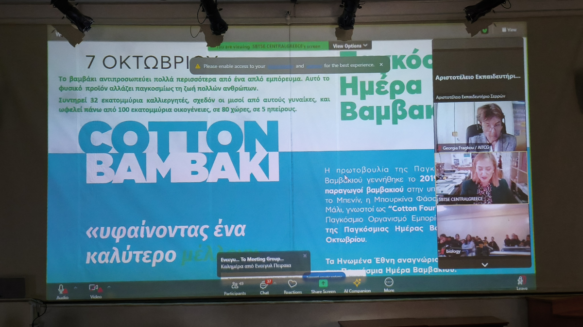 Στις 7 Οκτωβρίου, Παγκόσμια Ημέρα Βάμβακος, οι μαθητές και οι μαθήτριες του σχολείου μας είχαν την ευκαιρία να συμμετάσχουν σε μια πολύ ενδιαφέρουσα ενημέρωση για το βαμβάκι, από ομιλητές -ειδικούς για την παραγωγή και την αξία του, όπως ο Πρόεδρος της Πανελλήνιας Ένωσης Εξαγωγών Βάμβακος.