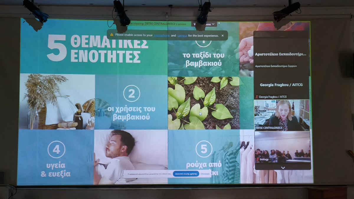 Τονίστηκε μάλιστα η δύναμη της χώρας μας στην εξαγωγή του προϊόντος στην ΕΕ, καθώς οι εξαγωγές της ανέρχονται σε ποσοστό 80% , με δεύτερη χώρα την Ισπανία. Οι μαθητές παρακολούθησαν τον κύκλο ζωής του βαμβακιού – από τη σπορά έως το έτοιμο προϊόν- και έμαθαν πόσο βιώσιμο είναι, καθώς δεν είναι υδροβόρο, ενώ είναι και ανθεκτικό στις μεταβαλλόμενες καιρικές συνθήκες.